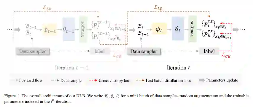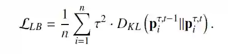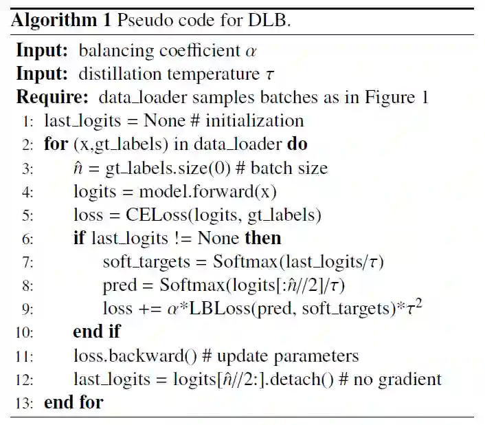 不同于以往采用预先训练 teacher 模型的方式生成(P_i^τ ) ̃,DLB 采用训练中前一个 Batch 蕴含的信息生成(P_i^τ ) ̃,并将其作为正则化的即时平滑标签。