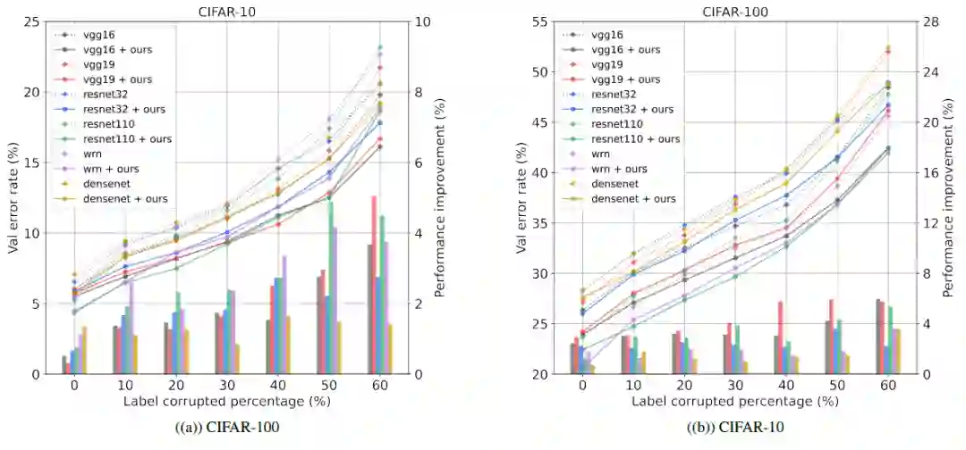 为了证明鲁棒性,研究员在训练之前向 CIFAR-100、CIFAR-10 随机注入标签噪声,实验结果如下图所示,DLB 可以有效地抵抗标签噪声并提高整体性能。