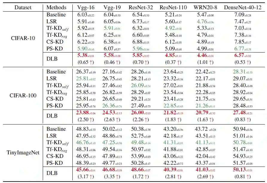 具体而言,在平均错误率层面, DLB 在 CIAFR-100 改进幅度为 0.83% 至 2.50%,在 CIFAR-10 上为 0.37% 至 1.01%,在 TinyImageNet 上为 0.81% 至 3.17。值得一提的是,DLB 的表现明显优于 Tf-KD 和 PS-KD,这证明了 DLB 在模型泛化提升上的优势。