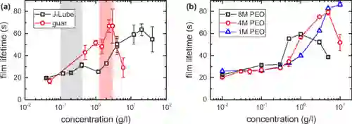 不同气泡溶液的薄膜寿命与浓度的关系(来源:Physical Review Fluids)