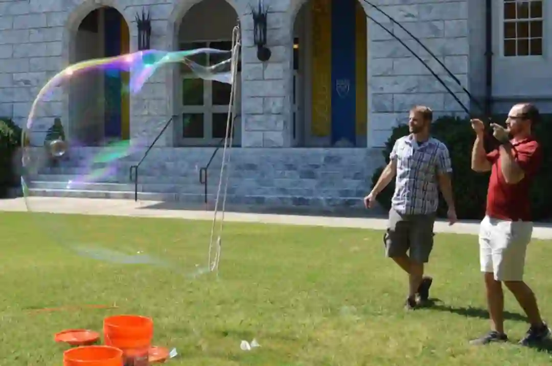 物理学家 Justin Burton (左)和研究生 Stephen Frazier 在埃默里大学的院子里用巨大的肥皂泡做实验(来源:Burton Lab/Emory University)