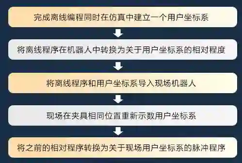 这种方法需要到现场示教校准程序,遁入电脑,计算误差,补偿离线程序之后再遁入机器人,操作步骤较多,比较麻烦