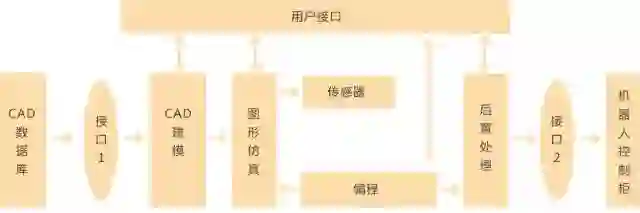 一般说来,机器人离线编程系统包括以下一些主要模块:传感器、机器人系统CAD建模、离线编程、图形仿真、人机界面以及后置处理等。如图所示: