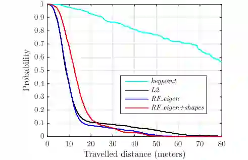 根据上述训练出的分类器,设假正例率FPR为 0.2 作为分类器的工作点。同时作者提出了一个供比较的baseline系统,该系统基于Harris 3D特征点提取,FPFH特征描述,并使用几何验证进行匹配。图5展示了没有成功定位的概率随车辆运行距离的变化。RF_eigen+shapes方法总是能够在55米内成功定位,而L2方法则需要67米,RF_eigen需要88米。对于L2方法,虽然速度最快,但是造成了14次错误的定位;而基于随机森林的两种方法在35米内定位成功的概率为95%。