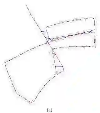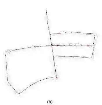 首先使用ICP算法来给相邻的激光雷达帧间添加约束,并且建立全局地图,这必然会导致漂移,如图6(a)所示,其中红点表示分割和回环检测的执行地点,蓝线表示检测到的回环,没有误检测。(b)图展示了添加回环约束,经过位姿图优化之后的地图。