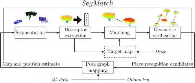 在3D数据中进行地点识别是一个具有挑战性的任务,已有算法通常是基于2D图像的。对应3D点云,一般有基于局部特征和基于全局特征两类方法。基于局部特征的方法的缺点在于具有歧义性和对环境变化不鲁棒,而基于全局特征的方法则依赖于观测点。作者提出了SegMatch,一种基于3D片段匹配的可靠地点识别算法。基于片段的描述子在基于局部和全局的描述子之间提供了良好的折衷,结合了他们的优势,同时减少了他们各自的缺点。SegMatch不依赖于“完美分割”的假设,也不依赖于环境中“对象”的存在,这使得该算法能够在大规模,非结构化环境中可靠地运行。作者定量地证明了SegMatch可以在KITTI数据集的序列上以1Hz的频率实现精确定位,同时进一步展示了该算法能够实时、可靠地检测闭环,这一操作是在线执行的。此外,SegMatch算法的源代码公开。