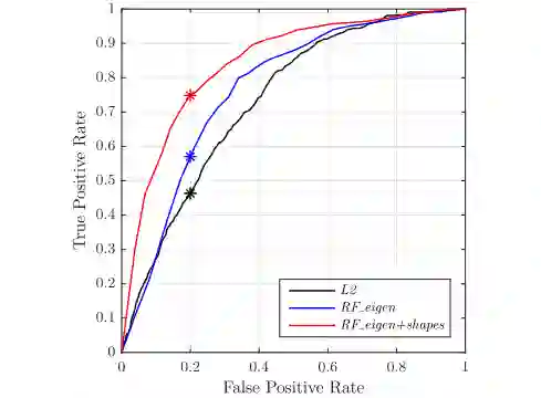 为了验证片段匹配方法的优劣,作者将本文提出的算法(RF_eigen+shapes)与基于欧氏距离阈值的算法(L2)和仅基于特征值特征的随机森林算法(RF_eigen)进行了对比,各算法的参数见下表,图3展示了ROC曲线,图4为示例的正确匹配的片段。
