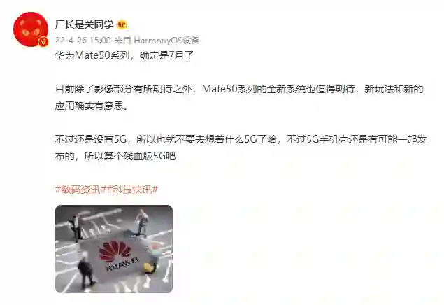 华为 Mate 数字系列已经成为国产高端旗舰机型的标杆,而当去年不少消费者期待华为 Mate 50 系列的时候,没想到该系列产品意外跳票。据 @厂长是关同学 爆料,华为 Mate 50 系列已经确认将于 7 月份发布。据悉,华为 Mate 50 系列将再次深挖影像系统,并全球首发鸿蒙 3.0 系统。但可惜的是,该系列机型依旧无缘 5G。