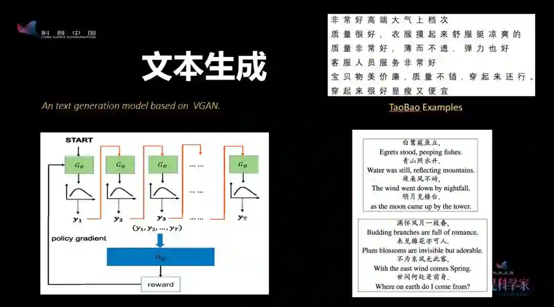 同样的思想也可以用到网购买家评论生成里。我们从淘宝或者亚马逊网站上找了很多人的评论,用这些语料作为训练基础来生成评论。比如关于衣服的:“这个宝贝物美价廉,质量不错,穿起来还行。”“穿起来很好,显瘦又便宜。”这些都是机器生成的,我们可以通过评论里潜在的规律做成这样的工作。