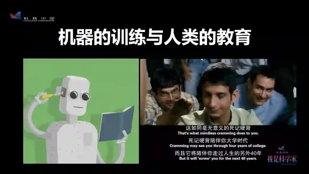 在这个生成的过程里“训练”是避免不了的,这跟人类似,人的教育其实也是一种训练。机器学习就是通过在大量的语料中找到规律。我们人的学习又何尝不是如此?电影《三傻大闹宝莱坞》里对我们传统的教育有很大的批判,很多教育本身也是在死记硬背,也是去找这种的规律。