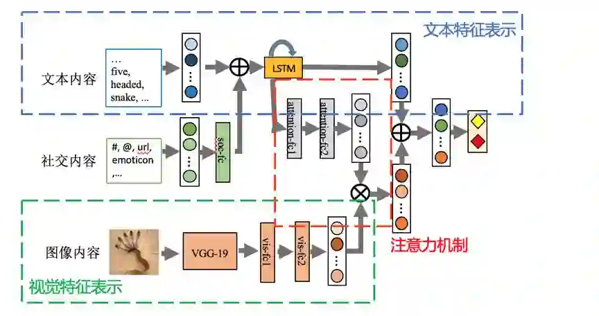 该模型通过两个部分提取各自模态的信息:一部分通过 VGG-19 抽取图像的语义特征,另一部分利用 Attention 机制抽取出文本与社交上下文中的关键信息。为了达到引导 VGG-19 网络抽取与事件相关语义特征的目的,文本和社交上下文中的关键信息与图片语义特征进行了逐元素相乘,以调整视觉语义信息的权重。实验表明,该方法可以发现许多单一模态难以判别的虚假新闻案例。