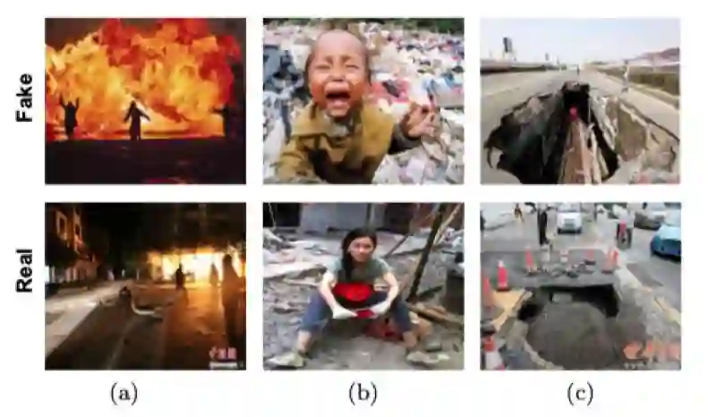 在语义层面上,虚假新闻配图通常更具有视觉冲击性(a)(c),和强烈的情感性(b)