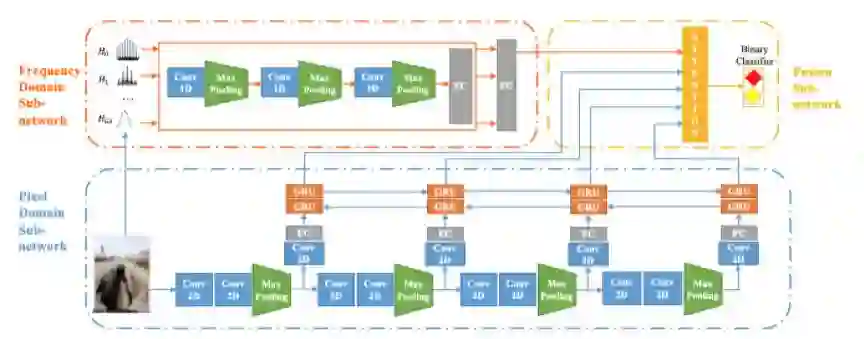 Qi 等人 [17] 发现虚假新闻图片不仅包含被恶意篡改的图片,也包含被错误的用来表示不相关事件的真实图片。然而现有的方法往往只适用于某一类型的虚假新闻图片,难以捕捉到虚假新闻图片整体的特征,从这一发现出发,Qi 等人设计了一个同时关注图像的频域与像素域的图像特征建模方法 MVNN 来深入挖掘图片在频域及像素域上潜在的视觉模式并进行高效表达和融合。