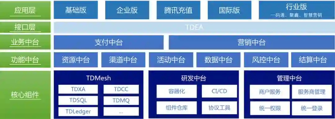 腾讯计费, 当前已是中台化设计,通过合理的功能组织,明确模块边界,内部类同逻辑的组件化抽象,及统一的服务鉴权、服务间配置、服务内事务、和服务的统一存储等规范,来实现整体服务的高可复用,提升研发效能。腾讯计费中台,由业务中台、功能中台、及基础的研发中台、核心的技术解决方案 TDMesh 组成。