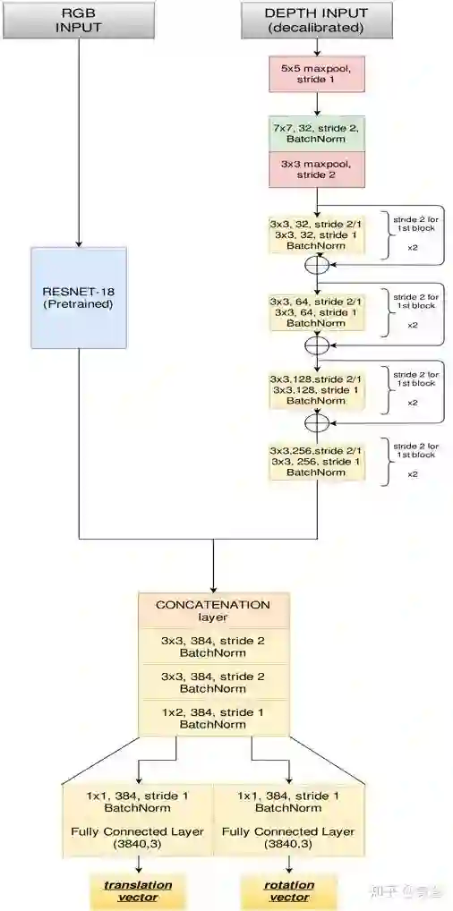该网络将RGB图像、相应的误标定(mis-calibration)的激光雷达点云和相机标定矩阵K作为输入。作为预处理步骤,首先将点云转换为稀疏深度图,将激光雷达点云投影到图像平面即可。由于初始误标定的不准确,将误标定点投影到图像平面会导致稀疏深度图与图像(严重)不一致,如上图(c)所示。将RGB输入图像和稀疏深度图标准化为±1的范围,然后用5 x 5最大池化窗将稀疏深度图最大池化为半致密深度图。