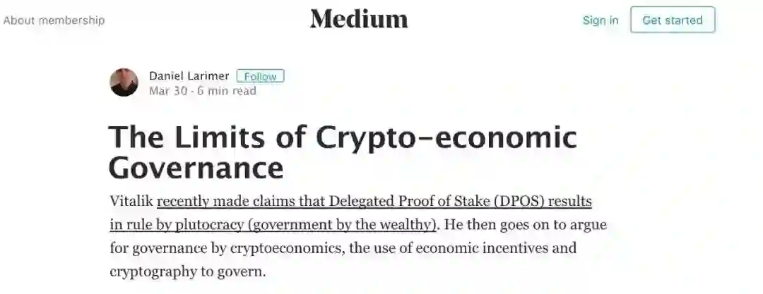Vitalik最近声称委托权益证明(DPOS)导致财阀统治(由富人统治的政府)。然后,他继续主张通过加密经济学进行治理,即使用经济激励和密码学来治理。