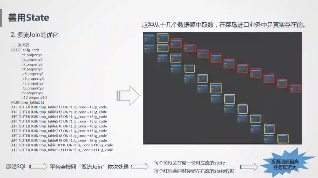 第二个是多流Join的优化,比如像上图左侧的伪代码,一张主表关联很多数据源产生一个明细大宽表,这是我们喜欢的方式,但是这样并不好,为什么呢?这样一个SQL在实时计算里会按照双流Join的方式依次处理,每次只能处理一个Join,所以像左边这个代码里有10个Join,在右边就会有10个Join节点,Join节点会同时将左流和右流的数据全部存下来,所以会看到右边这个图的红框里,每一个Join节点会同时存储左流和右流的节点,假设我们订单源有1亿,里面存的就是10亿,这个数据量存储是非常可怕的。