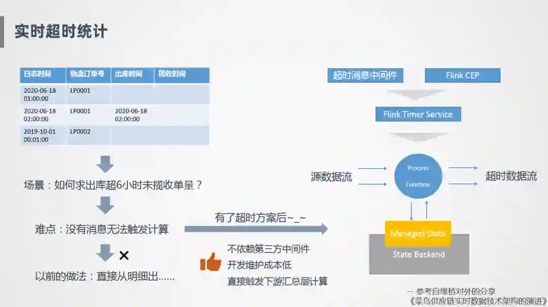实时超时统计就是一个典型的场景,比如说会有这样两笔订单,一笔订单1点钟创建了物流订单,2点钟进行出库,如何统计超6小时未揽收的收单量,因为没有消息就无法触发计算,Flink是基于消息触发的,比如说2点钟出库了,那理论上在8点钟的时候超6小时未揽收的单量要加1,但是因为没有消息触发,下游系统不会触发计算,这是比较难的事情,所以一开始没有特别好的方案,我们直接从明细表出,比如订单的出库时间是2点钟,生成这条明细之后,写到数据库的OLAP引擎里,和当前明细进行比较计算。