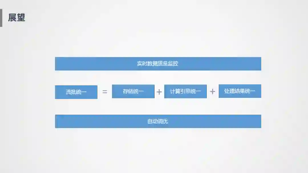流批统一有几个层面,第一个就是存储层面的统一,实时和离线写到同一个地方去,应用的时候更方便。第二个就是计算引擎的统一,比如像Flink可以同时支持批处理和流处理,还能够写到Hive里面。更高层次的就是可以做到处理结果的统一,同一段代码,在批和流的语义可能会不一样,如何做到同一段代码,批和流的处理结果是完全统一的。