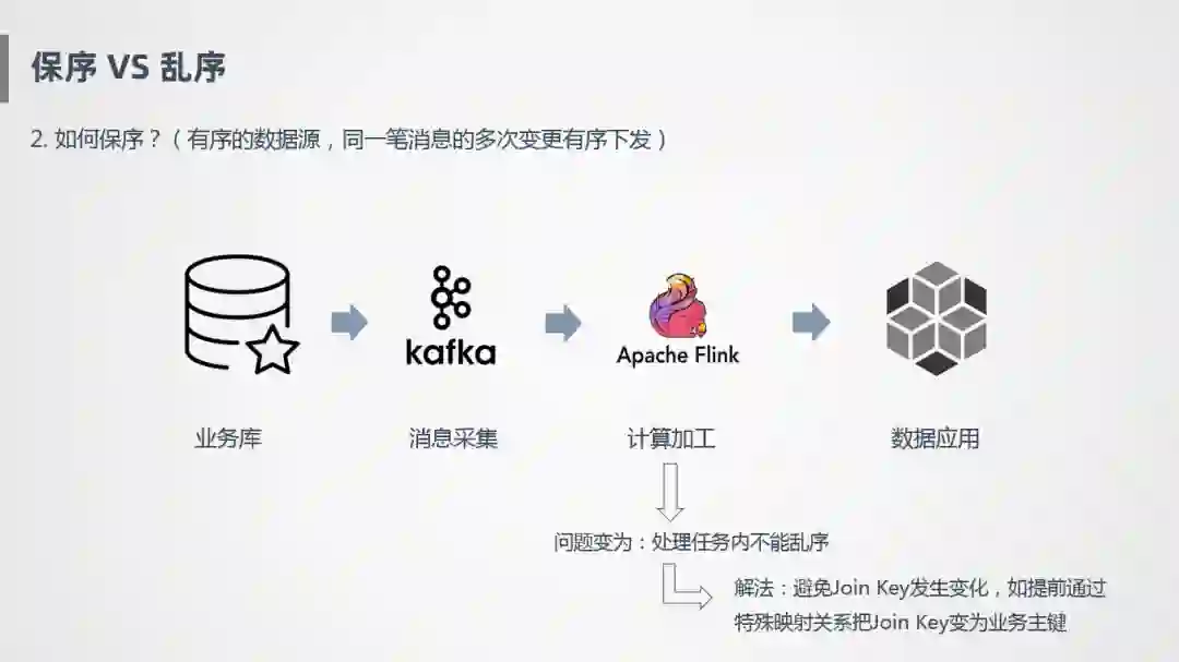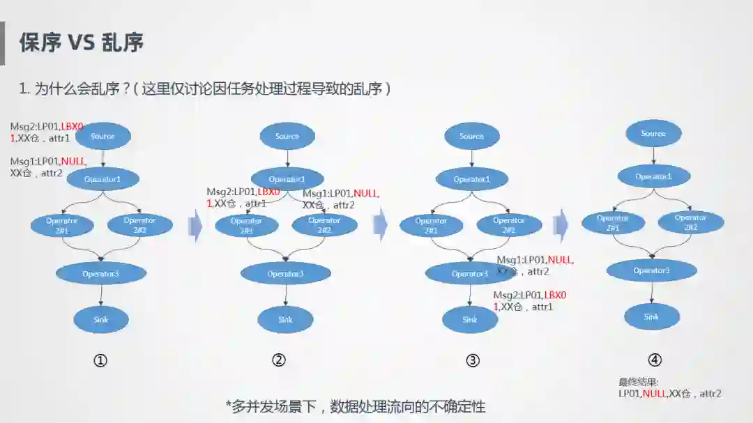举个例子比如说有两个单子都是物流单,根据单号取一些仓内的消息,消息1和消息2先后进入流处理里面,关联的时候根据JoinKey进行Shuffle,在这种情况下,两个消息会流到不同的算子并发上,如果这两个并发处理速度不一致,就有可能导致先进入系统的消息后完成处理,比如消息1先到达系统的,但是处理比较慢,消息2反倒先产出,导致最终的输出结果是不对的,本质上是多并发场景下,数据处理流向的不确定性,同一笔订单的多笔消息流到不同的地方进行计算,就可能会导致乱序。