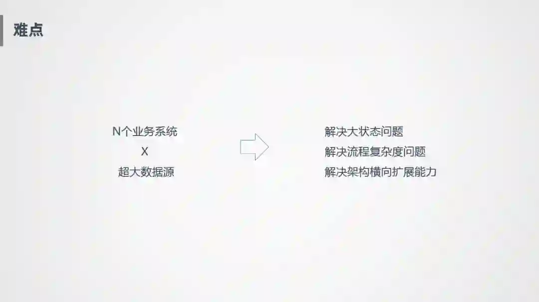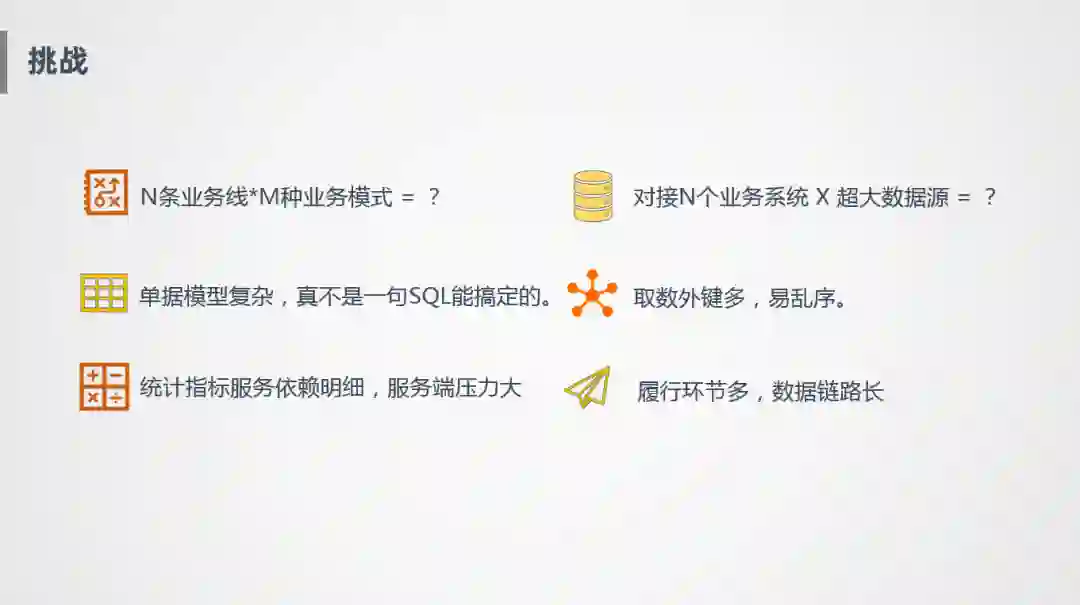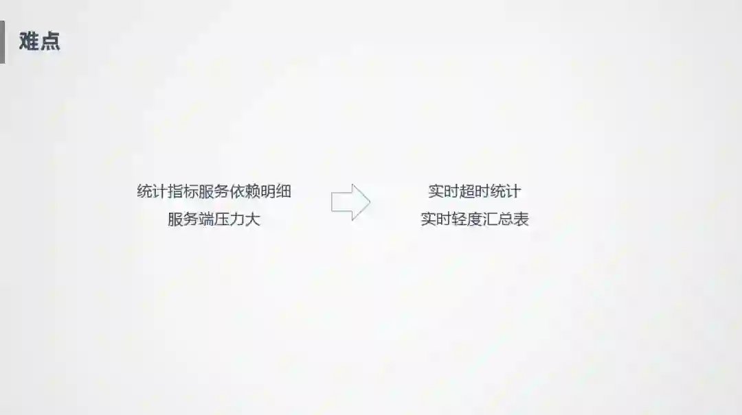 另外一个难点就是我们的很多统计指标都依赖明细,主要是一些实时统计,这种风险比较明显,服务端压力特别大,尤其是大促时,极其容易把系统拖垮。