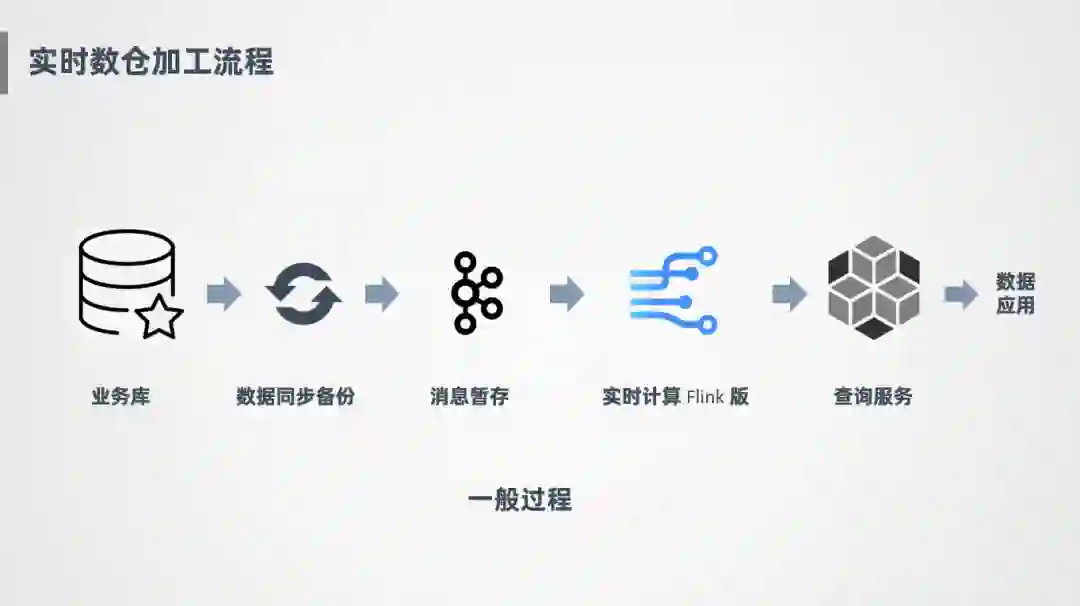 下面简单介绍一下实时数仓的加工流程,一般会对接业务库或者日志源,通过数据同步的方式,比如Sqoop或DataX把消息同步到消息中间件中暂存,下游会接一个实时计算引擎,对消息进行消费,消费之后会进行计算、加工,产出一些明细表或汇总指标,放到查询服务上供数据应用端使用。