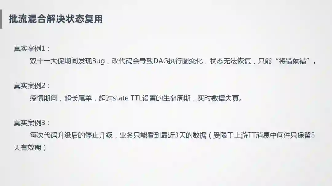 疫情期间的一些超长尾单,State的TTL设置都是60天,我们认为60天左右肯定能够全部完结,后来发现超过24天数据开始失真,明明设置的有效期是60天,后来发现底层State存储用的是int型,所以最多只能存20多天的有效期,相当于触发了Flink的一个边界case,所以也证明了我们这边的场景的确很复杂,很多状态需要超长的State生命周期来保证的。