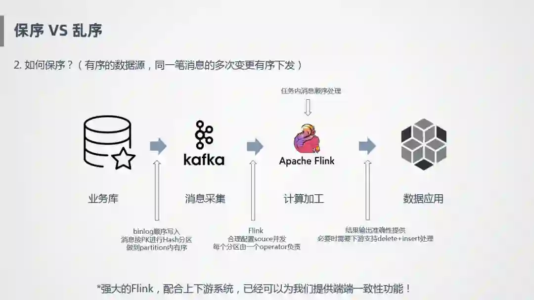 上图是一个简化的过程,业务库流入到Kafka,Binlog日志是顺序写入的,需要采用一定的策略,也是顺序采集,可以根据主键进行Hash分区,写到Kafka里面,保证Kafka里面每个分区存的数据是同一个Key,首先在这个层面保证有序。然后Flink消费Kafka时,需要设置合理的并发,保证一个分区的数据由一个Operator负责,如果一个分区由两个Operator负责,就会存在类似于刚才的情况,导致消息乱序。另外还要配合下游的应用,能保证按照某些主键进行更新或删除操作,这样才能保证端到端的一致性。