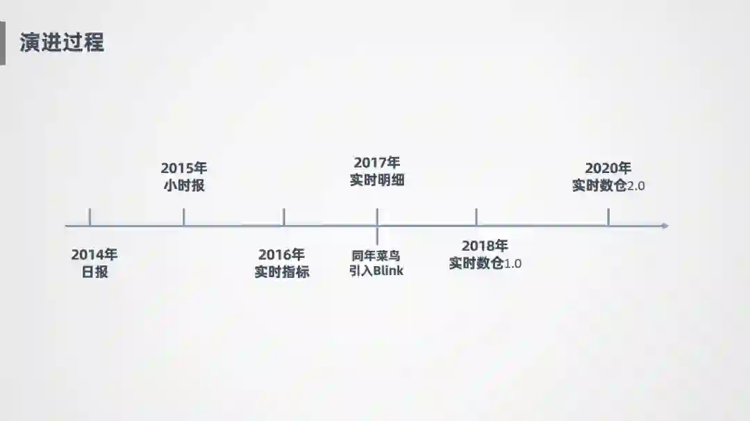 2017年:菜鸟引进了Blink,也就是Flink在阿里的内部版本,作为我们的流计算引擎,并且进口业务线在同一年打通了实时明细,通过实时明细大宽表对外提供数据服务。