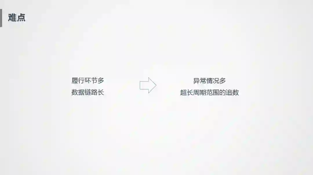另外一个难点就是我们的履行环节比较多,数据链路比较长,导致异常情况很难处理。比如消息要保留20多天的有效期,State也要存20多天,状态一直存在Flink里面,如果某一天数据出现错误或者逻辑加工错误,追溯是个很大问题,因为上游的消息系统一般保持三天数据的有效期。