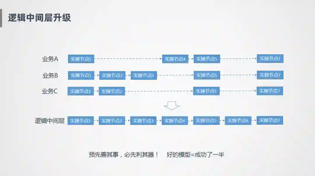 我们想到的比较简单的思路就是建设统一的数据中间层,比如业务A有出库、揽收、派送等几个业务节点,业务B可能是另外几个节点,整个模型是割裂的状态,但实际上业务发展到中后期比较稳定的时候,各个业务模式之间相对比较稳定,这个时候可以对数据进行一个抽象,比如业务A有节点1、节点5和其他几个业务模式是一样的,通过这种对齐的方式,找出哪些是公共的,哪些是非公共的,提取出来沉淀到逻辑中间层里,从而屏蔽各业务之间的差距,完成统一的数据建设。把逻辑中间层进行统一,还有一个很大的原因,业务A,B,C虽然是不同的业务系统,比如履行系统,关务系统,但是本质上都是同一套,底层数据源也是进行各种抽象,所以数仓建模上也要通过统一的思路进行建设。