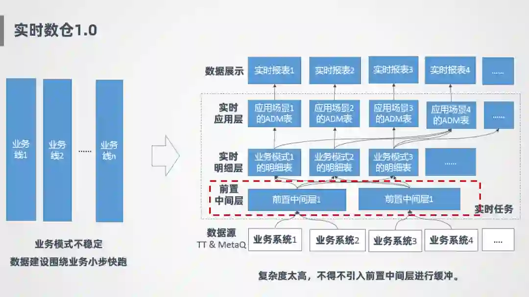 接下来讲一下实时数仓1.0的情况,一开始因为在发展初期,业务模式不太稳定,所以一开始的策略就是围绕业务小步快跑,比如针对业务1会开发一套实时明细层,针对业务2也会开发一套实时任务,好处是可以随着业务发展快速迭代,互相之间不影响,早期会更灵活。