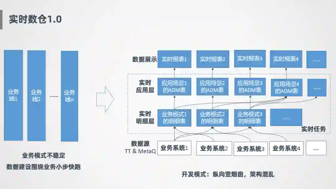 如上图右侧所示,最底层是各个业务系统的消息源,实时任务主要有两层,一层是实时明细层,针对业务线会开发不同的明细表,明细表就是针对该条业务线需要的数据把它抽取过来,在这之上是ADM层,也就是实时应用层,应用层主要针对具体的场景定制,比如有个场景要看整体汇总指标,则从各个明细表抽取数据,产生一张实时汇总层表,整个过程是竖向烟囱式开发,模型比较混乱,难扩展,并且存在很多重复计算。
