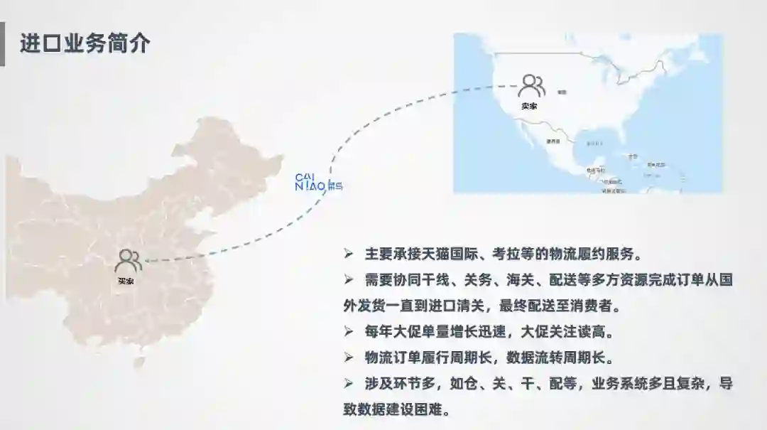 进口业务的流程大致比较清晰,国内的买家下单之后,国外的卖家发货,经过清关,干线运输,到国内的清关,配送,到消费者手里,菜鸟在整个过程中负责协调链路上的各个资源,完成物流履约的服务。去年考拉融入到阿里体系之后,整个进口业务规模占国内进口单量的规模是非常高的。并且每年的单量都在迅速增长,订单履行周期特别长,中间涉及的环节多,所以在数据建设时,既要考虑把所有数据融合到一起,还要保证数据有效性,是非常困难的一件事情。