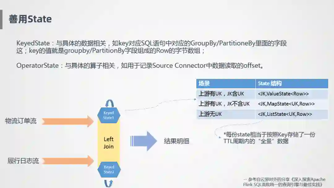 下面举个例子,怎么用到KeyedState,比如物流订单流和履行日志流,两个作业关联产生出最终需要的一张大表,Join是怎么存储的呢?流是一直不停的过来的,消息到达的前后顺序可能不一致,需要把它存在算子里面,对于Join的状态节点,比较简单粗暴的方式是把左流和右流同时存下来,通过这样的方式保证不管消息是先到还是后到,至少保证算子里面数据是全的,哪怕其中一个流很晚才到达,也能保证匹配到之前的数据,需要注意的一点是,State存储根据上游不同而不同,比如在上游定义了一个主键Rowkey,并且JoinKey包含了主键,就不存在多笔订单对应同一个外键,这样就告诉State只需要按照JoinKey存储唯一行就可以了。如果上游有主键,但是JoinKey不包含Rowkey 的话,就需要在State里将两个Rowkey的订单同时存下来。最差的情况是,上游没有主键,比如同一笔订单有10条消息,会有先后顺序,最后一条是有效的,但是对于系统来说不知道哪条是有效的,没有指定主键也不好去重,它就会全部存下来,特别耗资源和性能,相对来说是特别差的一种方式。