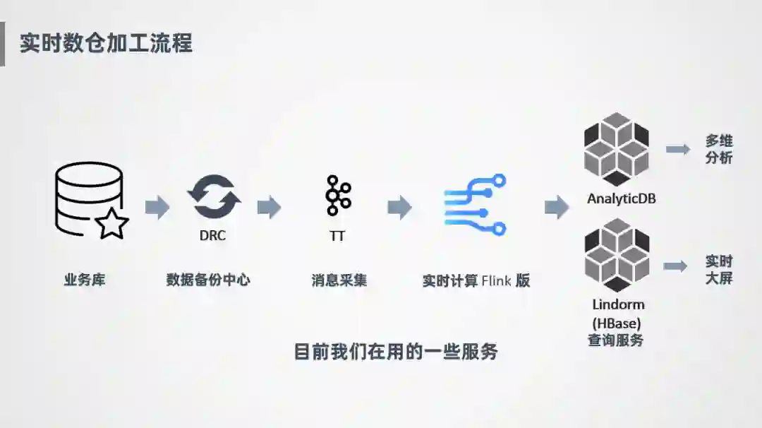 在菜鸟内部也是同样的流程,我们将业务库数据通过DRC ( 数据备份中心 ) 增量采集Binlog日志的方式,同步到TT ( 类似Kafka的消息中间件 ) 做一个消息暂存,后面会接一个Flink实时计算引擎进行消费,计算好之后写入两种查询服务,一种是ADB,一种是HBase ( Lindorm ),ADB是一个OLAP引擎,阿里云对外也提供服务,主要是提供一些丰富的多维分析查询,写入的也是一些维度比较丰富的轻度汇总或明细数据,对于实时大屏的场景,因为维度比较少,指标比较固定,我们会沉淀一些高度汇总指标写到HBase中供实时大屏使用。
