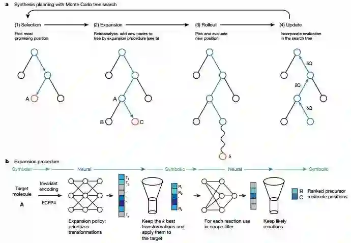 在这项研究工作中,Waller团队将深度神经网络及强化学习等概念整合至一个通用的架构中,提出了采用三种不同的神经网络结合蒙特卡洛树搜索(Three different neural networks together with MCTS)的算法框架(3N-MCTS)。这三种神经网络分别为:拓展策略网络(Expansion policy network)——用来搜索当前位置可能存在的单步逆向化学变换路径(Transformation);筛选网络(Filter network)——用来对反应的可行性做出判断;展示策略网络(Rollout policy network)——用来在展示步骤中应用多次采样方法对搜索节点进行定量评价。该工作相对于传统基于规则的反合成设计来说,大量借鉴了深度神经网络及强化学习的思想,是对传统方法的一次重要的改进,这也是该工作能够发表于Nature的原因之一。