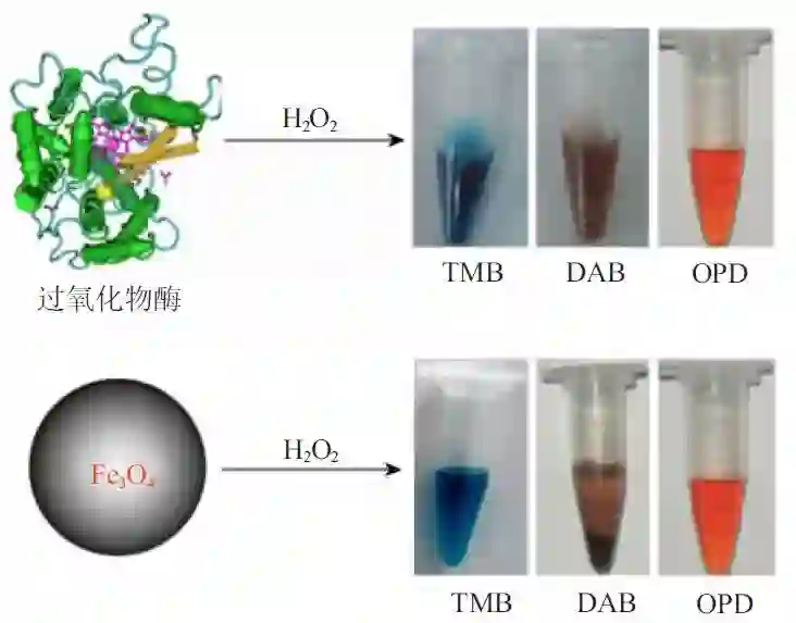 图4. 四氧化三铁纳米酶可以像天然过氧化物酶一样催化相同的颜色反应。(NatureNanotechnology. 2007)