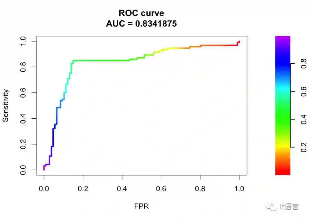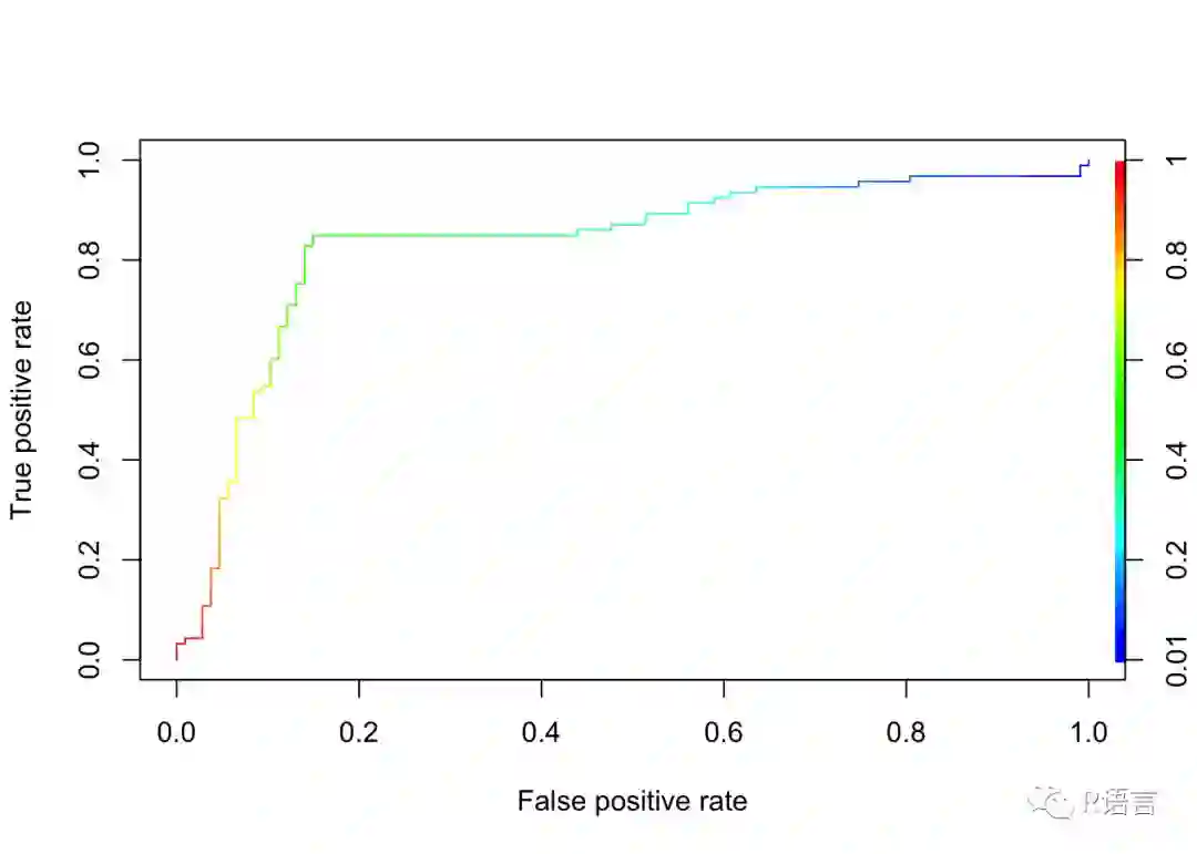 下面的代码使用包附带的合成数据集并绘制默认的ROCR ROC曲线。在本文中,我将使用相同的数据集。