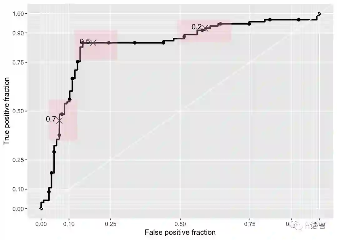 plotROC是使用ggplot()绘制ROC曲线的理想选择。我的猜测是,它似乎只受到有限的欢迎,因为文档使用了医学术语,如“疾病状态”和“标记”。尽管如此,文档(包括a vignette and a Shiny application)非常好。