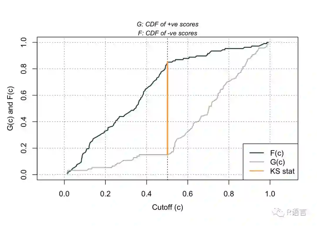 其他一些可视化是可能的。下图显示了正面和负面反应的累积密度。KS统计量显示了两条曲线之间的最大距离。