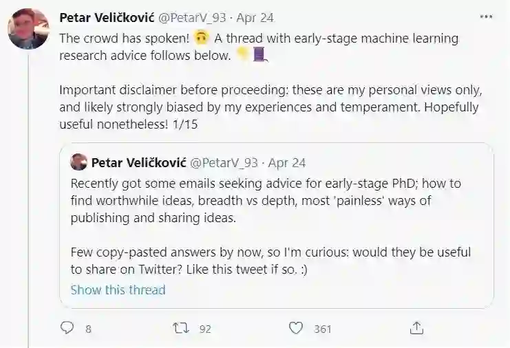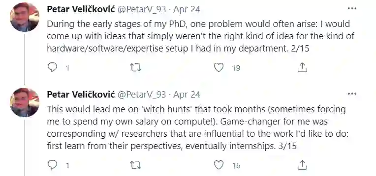 【导读】如何入门科研,做出有影响力的研究?这是每个读博同学所关心的。最近GAT作者DeepMind研究科学家Petar Veličković在个人Twitter上分享了他早期读博的一些经历和建议,非常值得思考,包括要多找大牛组实习,对自己的想法“硬编码”验证,可以先投Workshop来通过圈内人Review反馈自己的工作等。希望对各位读博同学有用。