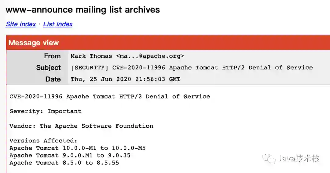 这是一封来自 Apache 官方安全团队的邮件,已通过 Apache Tomcat 用户邮件公开报告了此问题,邮件中介绍了 HTTP/2 拒绝服务漏洞的各方面细节及解决方案。