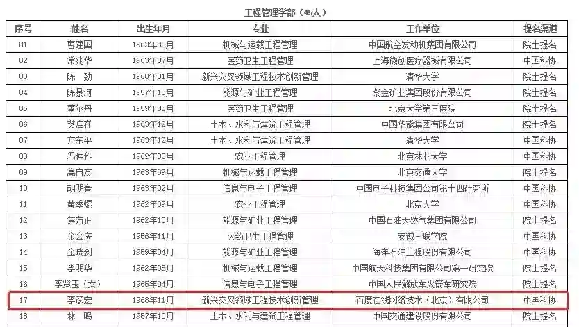 中国工程院公布的2019年院士增选有效候选人名单,李彦宏位列其中。