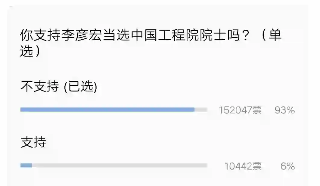 公号《大汉丞相》的投票中,反对李彦宏当选中国工程院院士的比例超过90%
