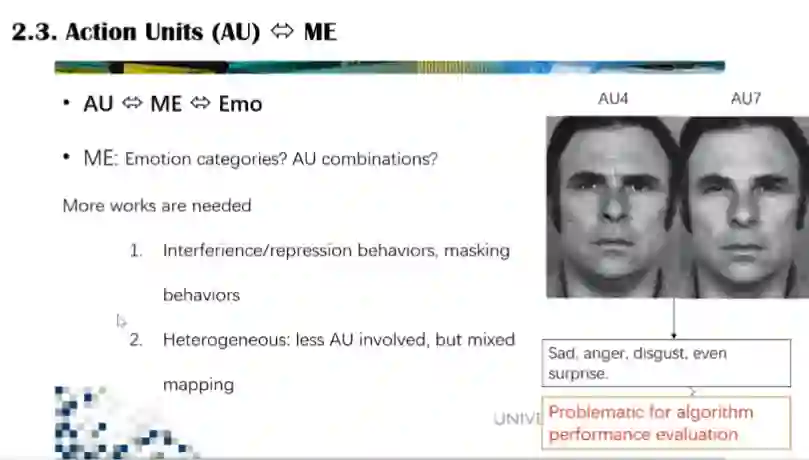 在探索动作单元和微表情的关系方面,李博士首先回顾了人脸动作编码系统和常规人脸表情的关系,提出动作单元(Action Unit, AU)为表情分析提供了相对客观的对应关系。但是对于微表情,AU和微表情的对应关系仍不甚明确,包括微表情的情绪分类问题,不同情绪对应哪些AU组合的问题等。
