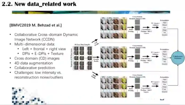 李博士还介绍了她们发表在BMVC2019会议的文章,探讨了哪些方法可以用在4D微表情研究。该文章中,为了减轻输入网络负担、保留有效信息,将样本信息退回到二维,构建了多通道的网络,将深度信息、校正深度信息、纹理信息合成为一个跨域图像序列进行分析。同时,李博士讨论了如何对4D数据进行数据增强,特别是对于微表情,3D重建存在精确度缺失和引入噪声的问题。
