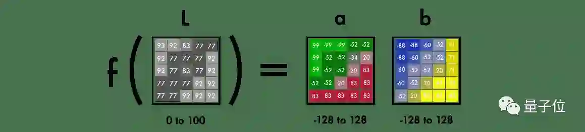 如下所示,Lab编码的图像具有一个灰度层,并将三个颜色层压成两层,这意味着在最终预测中可以使用原始灰度图像。此外,我们只需预测两个通道。