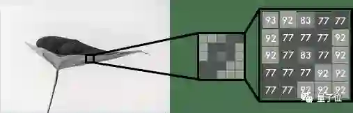 黑白图像可以在像素网格中表示。每个像素有对应于其亮度的值,取值范围为0 - 255,从黑色到白色。