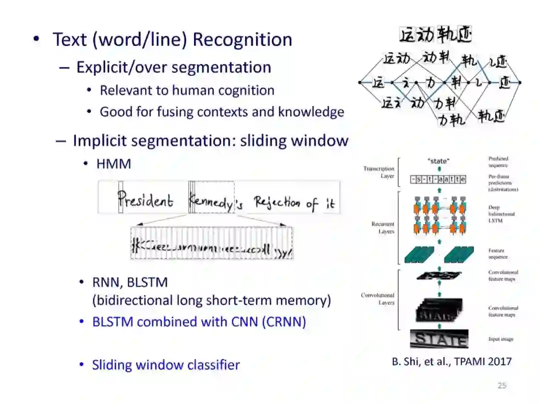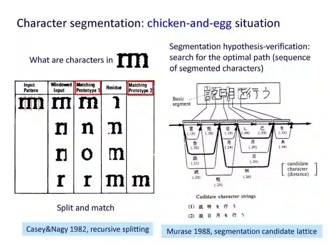 自上世纪50年代以来,文字识别(广义地,称为文档分析)的研究和应用取得了巨大的进展。50-70年代以统计模式识别和特征匹配方法为主;80-90年代提出了很多结构分析方法,并且字符切分、字符串识别和版面分析受到重视;2000年以来继续在文档分析与识别的各个方面持续提高;2013年开始深度学习(深度神经网络)逐渐成为主导性的方法,使文字检测和识别的性能得到明显提升。随着识别精度不断提升和应用的展开,文字识别的可靠性、泛化性、可解释性要求开始凸显,在这些方面传统的模式识别和文字识别方法表现出一定的优势或互补性,与深度学习方法结合可开辟新的研究途径。本报告对文字识别领域历史上主要方法进行回顾,对当前主要方法的特点和一些最新研究动态进行分析,并对将来的研究提出一些建议。